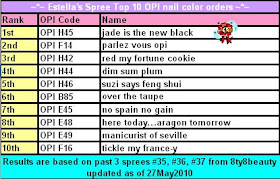 it's been very long since i last update the list of the popular colors ordered. hehe.. i've consolidated the list of TOP 10 OPI colors spree-ers are ordering for the past 3 sprees. I hope it will be a useful guide if you are not sure what colors are nice =)